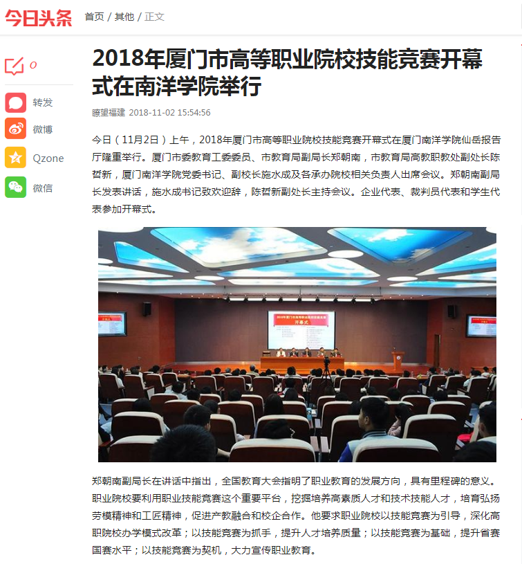 今日(11月2日)上午,2018年厦门市高等职业院校技能竞赛开幕式在厦门南洋学院仙岳报告厅隆重举行。厦门市委教育工委委员、市教育局副局长郑朝南,市教育局高教职教处副处长陈哲新,厦门南洋学院党委书记、副校长施水成及各承办院校相关负责人出席会议。郑朝南副局长发表讲话,施水成书记致欢迎辞,陈哲新副处长主持会议。企业代表、裁判员代表和学生代表参加开幕式。