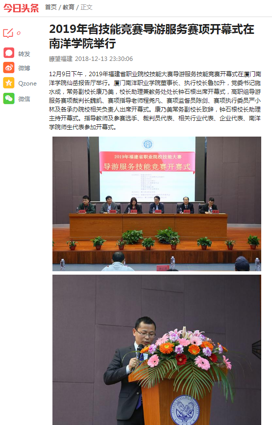 康乃美常务副校长在致辞中指出,人才是国家的竞争力,技能型人才培养是高职院校的竞争力,而职业技能大赛是标准化检验技能型人才培养质量的重要方式。这是南洋学院第一次承办省赛导游服务赛项,也是厦门市民办高校第一次承办省赛赛项,学校董事会高度重视赛事筹备,成立赛点筹备工作领导小组,组长由原福建省教育工委常务副书记、副厅长,现任南洋学院校长王豫生研究员担任,制订了较为完善的筹备工作手册,组建了技术保障组、接待及宣传组等6个工作组,落实分工责任。董事长鲁加升亲自召开协调会,到酒店检查接待服务细节,中层以上干部全部投入接待工作,各部门全力以赴保证本次大赛顺利进行,全心全意提供便捷周到的服务。