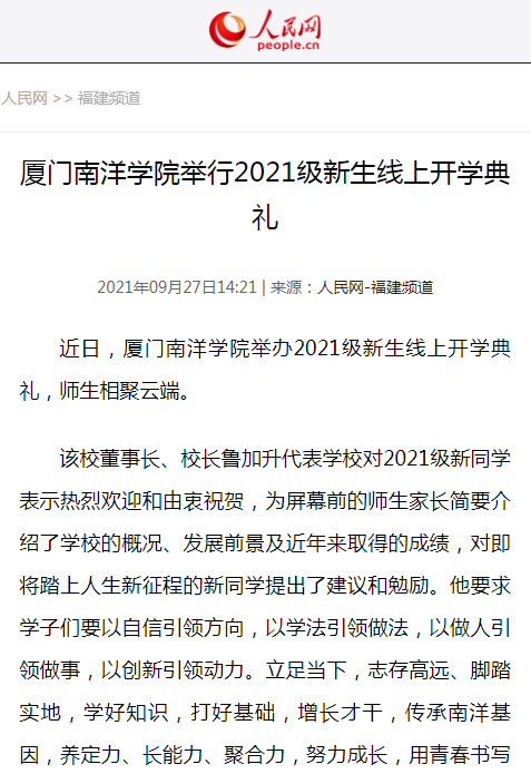 人民网:厦门南洋学院举行2021级新生线上开学典礼