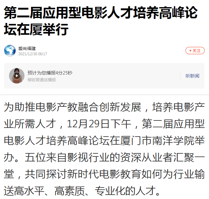 搜狐新闻:第二届应用型电影人才培养高峰论坛在厦举行