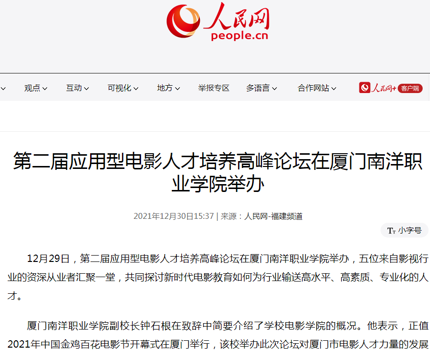 人民网:第二届应用型电影人才培养高峰论坛在厦门南洋职业学院举办