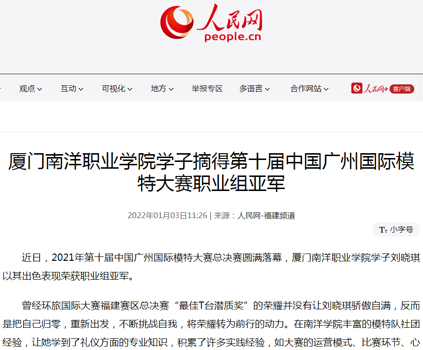 人民网:厦门南洋职业学院学子摘得第十届中国广州国际模特大赛职业组亚军