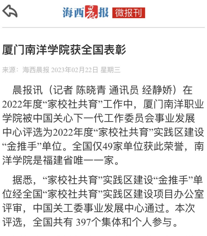 晨报讯(记者 陈晓青 通讯员 经静娇)在2022年度“家校社共育”工作中,厦门南洋职业学院被中国关心下一代工作委员会事业发展中心评选为2022年度“家校社共育”实践区建设“金推手”单位。全国仅49家单位获此荣誉,南洋学院是福建省唯一一家。