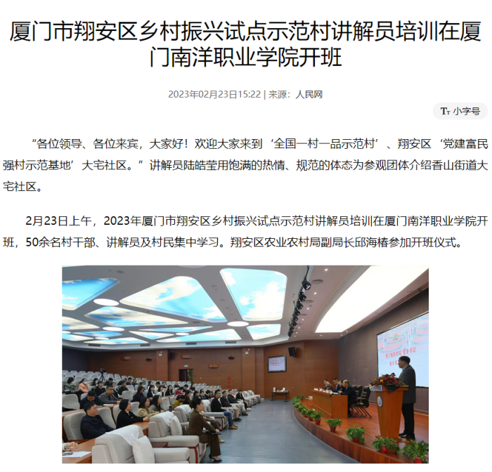2月23日上午,2023年厦门市翔安区乡村振兴试点示范村讲解员培训在厦门南洋职业学院开班,50余名村干部、讲解员及村民集中学习。翔安区农业农村局副局长邱海椿参加开班仪式。