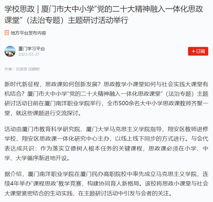 新时代新征程,思政课如何创新发展?思政教学小课堂如何与社会实践大课堂有机结合?厦门市大中小学“党的二十大精神融入一体化思政课堂”(法治专题)主题研讨活动日前在厦门南洋职业学院举行,全市500余名大中小学思政课教师齐聚一堂,就这些课题进行交流探讨。