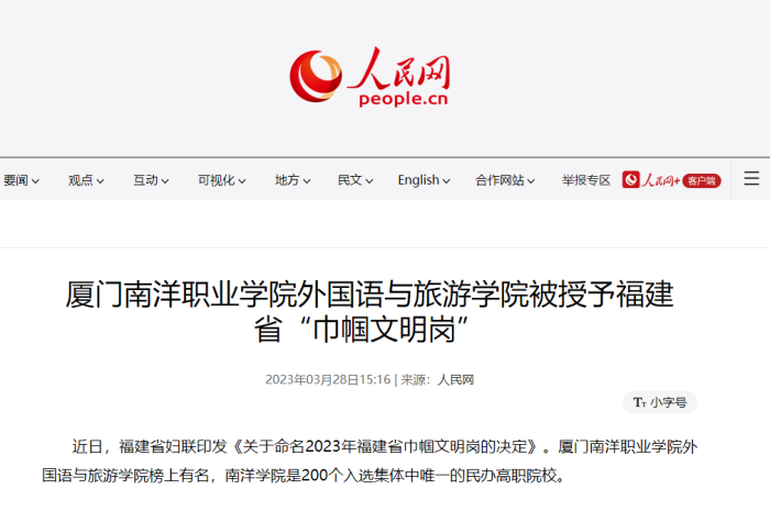 近日,福建省妇联印发《关于命名2023年福建省巾帼文明岗的决定》。厦门南洋职业学院外国语与旅游学院榜上有名,南洋学院是200个入选集体中唯一的民办高职院校。
