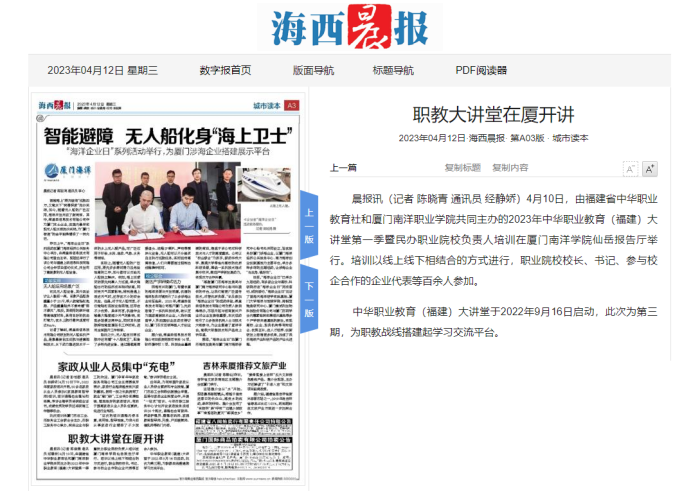 晨报讯(记者 陈晓青 通讯员 经静娇)4月10日,由福建省中华职业教育社和厦门南洋职业学院共同主办的2023年中华职业教育(福建)大讲堂第一季暨民办职业院校负责人培训在厦门南洋学院仙岳报告厅举行。培训以线上线下相结合的方式进行,职业院校校长、书记、参与校企合作的企业代表等百余人参加。