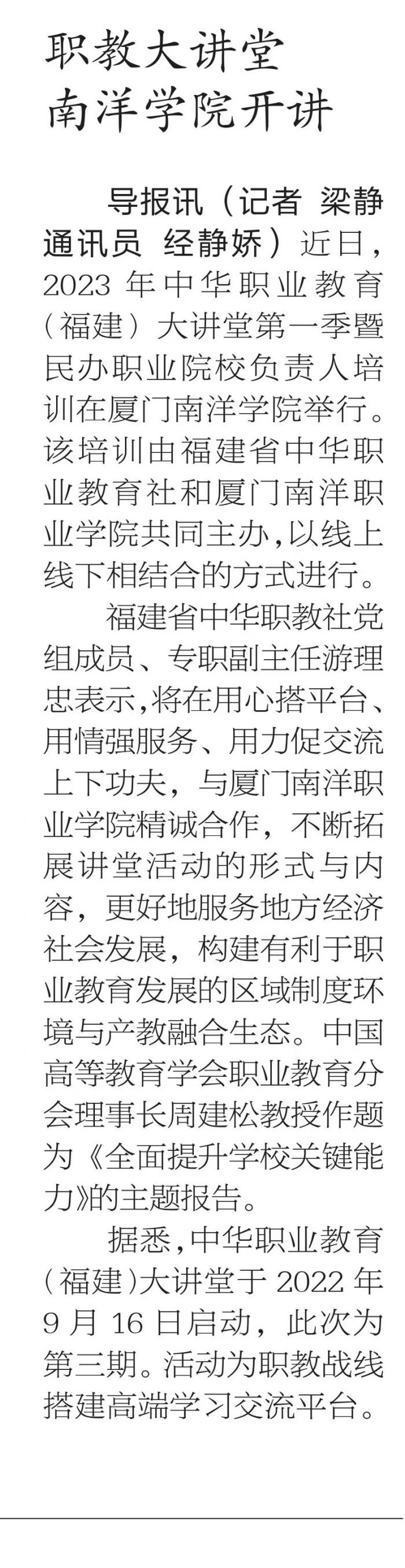 导报讯(记者 梁静 通讯员 经静娇)近日,2023年中华职业教育(福建)大讲堂第一季暨民办职业院校负责人培训在厦门南洋学院举行。该培训由福建省中华职业教育社和厦门南洋职业学院共同主办,以线上线下相结合的方式进行。