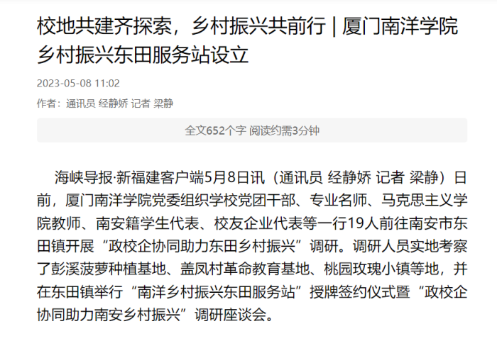 海峡导报·新福建客户端5月8日讯(通讯员 经静娇 记者 梁静)日前,厦门南洋学院党委组织学校党团干部、专业名师、马克思主义学院教师、南安籍学生代表、校友企业代表等一行19人前往南安市东田镇开展“政校企协同助力东田乡村振兴”调研。调研人员实地考察了彭溪菠萝种植基地、盖凤村革命教育基地、桃园玫瑰小镇等地,并在东田镇举行“南洋乡村振兴东田服务站”授牌签约仪式暨“政校企协同助力南安乡村振兴”调研座谈会。