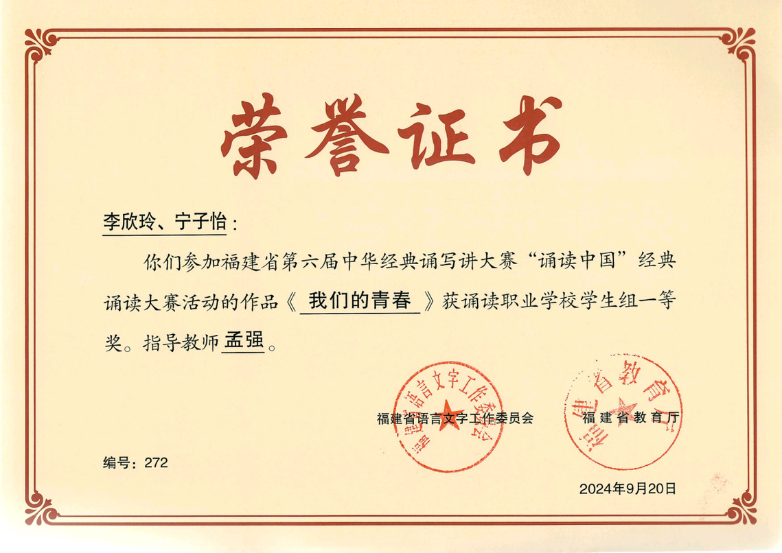 师生在各种赛事斩获佳绩,先后荣获福建省大学生戏剧节一、二等奖,福建省职业院校技能大赛声乐、器乐表演(高职组)一等奖,福建省戏剧水仙花奖三等奖,福建省经典诵读一、二、三等奖等好成绩。