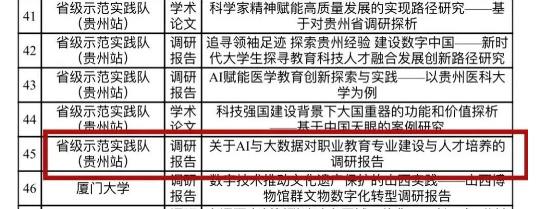 近日,中共福建省委教育工委印发《“追寻领袖足迹 担当强国使命”2025年全省大学生暑期社会实践活动评选结果的通知》,我校与集美大学、厦门理工学院、厦门医学院联合组建的“省级示范实践队(贵州站)”荣膺“优秀实践团队”称号,实践队撰写的《关于AI与大数据对职业教育专业建设与人才培养》调研报告获评“优秀实践成果”,双线获奖彰显我校实践育人丰硕成果。