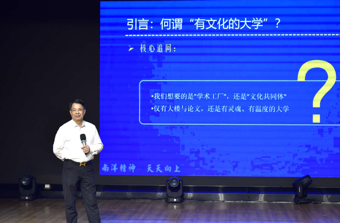 鲁加升教授从大学文化的历史根基与时代命题、大学文化的核心要素与运行逻辑、厦门南洋学院的文化建设探索、大学文化的未来图景四个方面,结合自身40余年教育实践经验,系统阐述了大学文化建设的精神内涵与发展方向,用鲜活的办学案例、深刻的教育思考,激发了在场教职工的强烈共鸣与深入思考。他开篇点题,强调“文化是一个大学最根本的竞争力”,为整场讲座奠定了鲜明的基调。