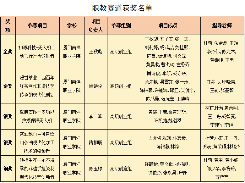 “我们要用项目驱动成长,实战锤炼本领,让‘创新创业’的种子深植于多元开放的沃土之上,培育出懂技术、又善经营、更具有社会责任感的复合型人才。”金奖项目“初源科技——无人机自动飞行巡检领航者”指导教师林莉说道。“初源科技”项目是本届高职创业组的第一名。她表示厦门南洋学院“3+3创”人才培养模式及“政—校—企—村”四位一体实践模式,培养了学生职业技术和社会素养,激发学生创新创业能力。
