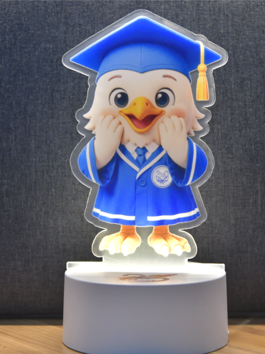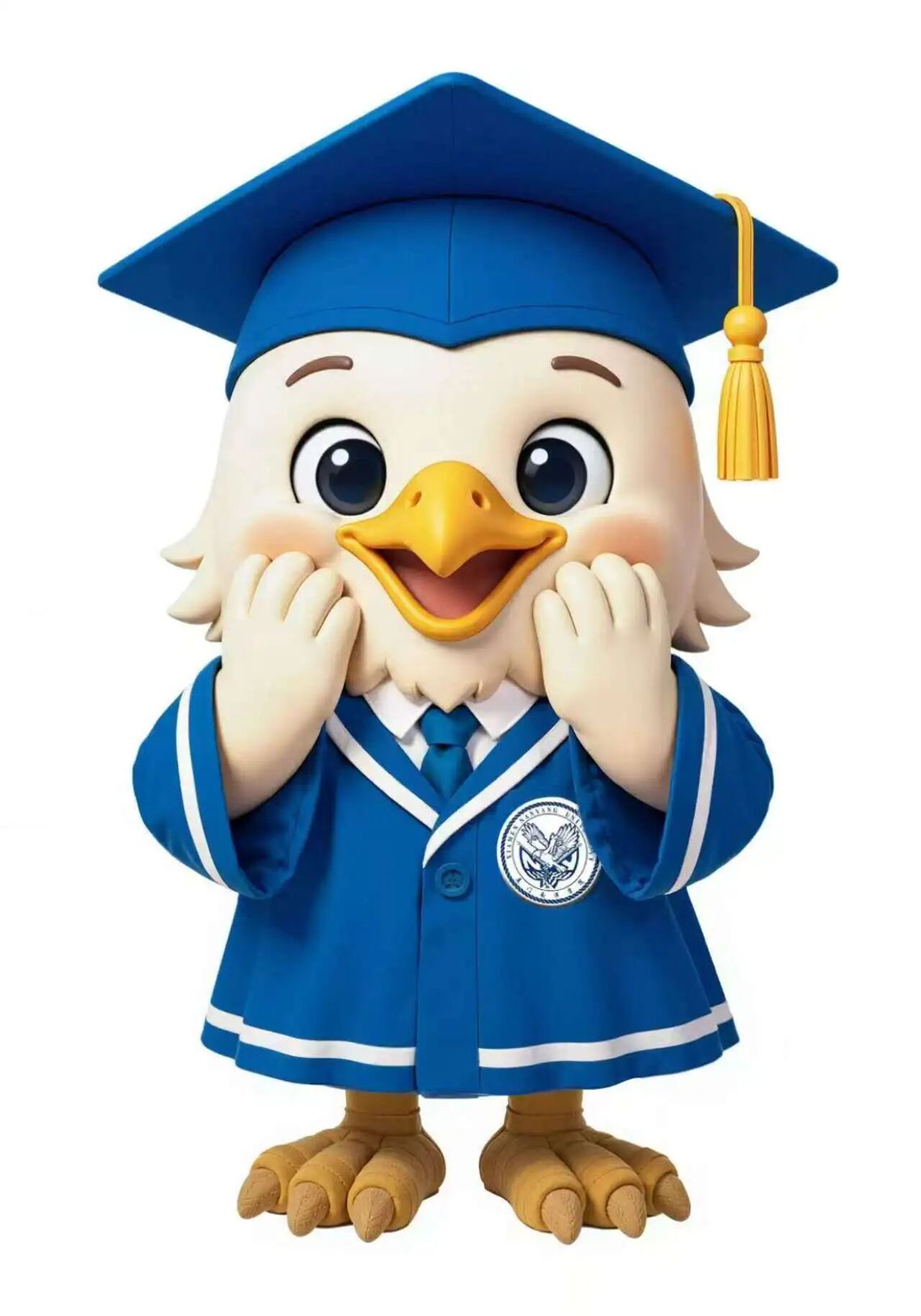 25周年校庆IP“阿南”的设计灵感以雄鹰为原型,身着蓝色学位服与方帽,胸前校徽象征荣誉与传承。圆润的大眼睛与灿烂笑容,展现青春与活力,双手贴脸的动作传递亲切与喜悦。整体设计简洁明快、亲和力强,IP形象保留了“阿南”本体的鹰爪,让南洋雄鹰的元素更加直观既寓意学子志存高远、勇敢逐梦,也彰显学校25年办学历程的辉煌与温暖。